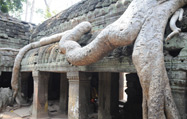 アンコール遺跡周辺にある、巨大なガジュマルの根によって崩壊の進む大仏教寺院「タ・プローム」。遺跡の崩壊は深刻ですが、遺跡発見当時の感動も伝わります。