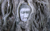 至るところに遺跡が点在する古都アユタヤ。1991年にユネスコ世界文化遺産に登録されました。古くから交易で栄え、日本人町跡も残ります。写真はワット・マハタートの仏頭です。