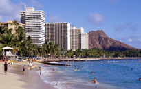高層ホテル群を背にワイキキビーチの向こうにダイヤモンドヘッドを望む風景はハワイの象徴。サーフィンなどのマリンアクティビティも盛んで、食事、買い物もとても便利!
