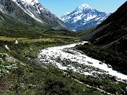 先住民マオリの人達に「アオラキ」と呼ばれるマウント・クックは、標高3,724mのニュージーランド最高峰。マウント・クックをはじめとする国立公園内には23を数える3,000m級の山々がそびえています。