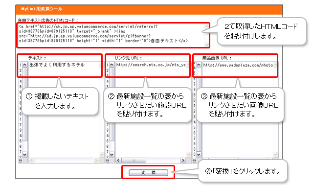 3. マイリンク変換ページを開きます。下記の図にしたがって変換ボタンをクリックするまで作業していきます。