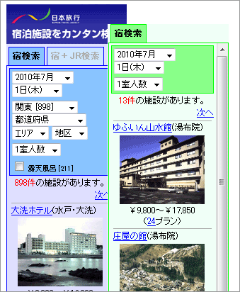 日本旅行ガジェットは、エリア・日付・ご予算・人数などの基本情報を選択して【日本旅行】国内宿泊予約で利用できる全国の旅館・ホテルが簡単に検索できます。ホームページに貼り付けたり、ブログパーツとしても利用できるようになっています。 どのように宿泊施設が表示されるのかは右図をご覧ください。