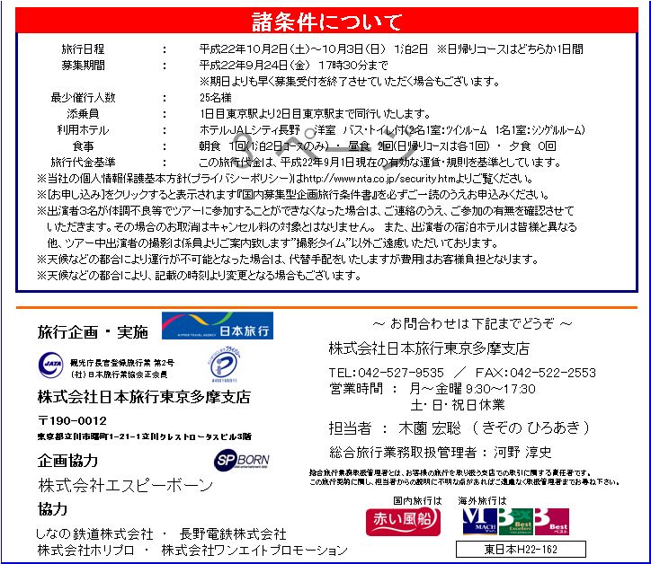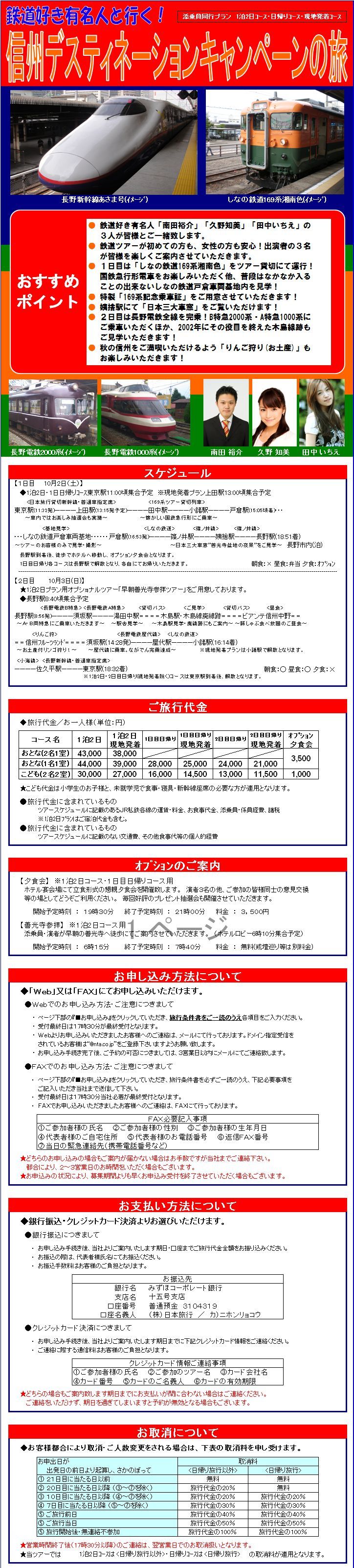 鉄道好き有名人「南田裕介」「久野知美」「田中いちえ」と行く!信州の旅 は2010年10月2日〜10月3日に実施します!