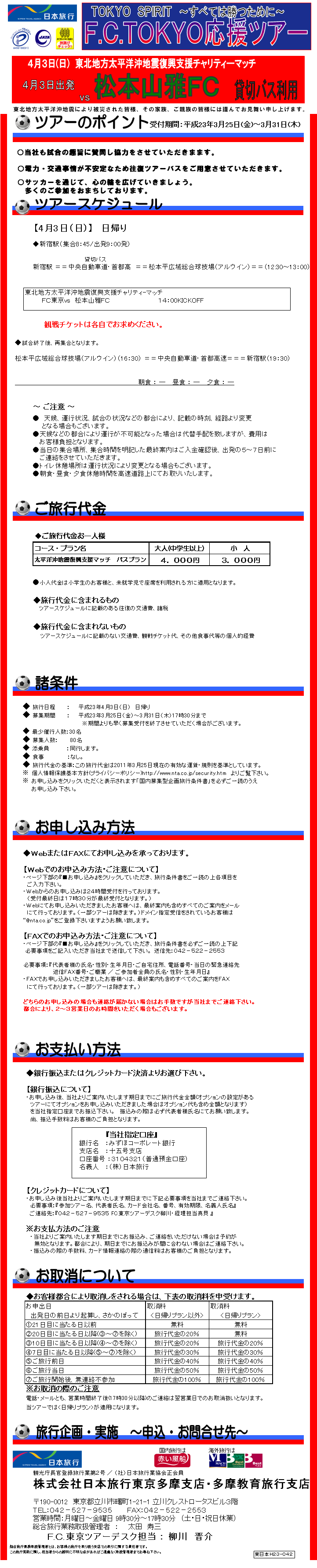 > 東北地方太平洋沖地震復興支援チャリティーマッチ 4月3日(日)14:00 KICKOFF応援ツアー 貸切バス利用プラン