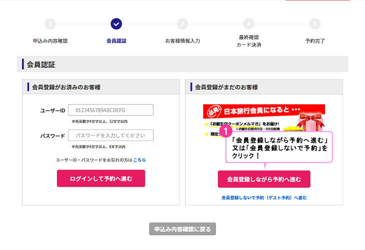 ログイン又は会員登録をし、次のステップへお進みください。会員登録をしないゲスト予約も可能です。