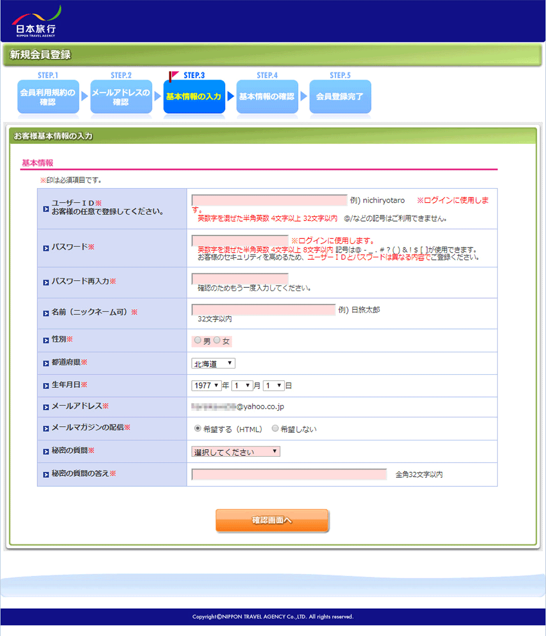 確認メールは、件名「<日本旅行>メールアドレス確認」で送りします。