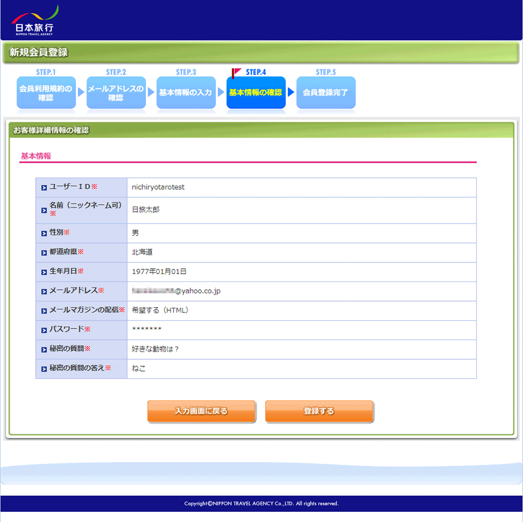 間違いがある場合は、画面下の「入力画面に戻る」ボタンを押して、入力画面にて修正してください。