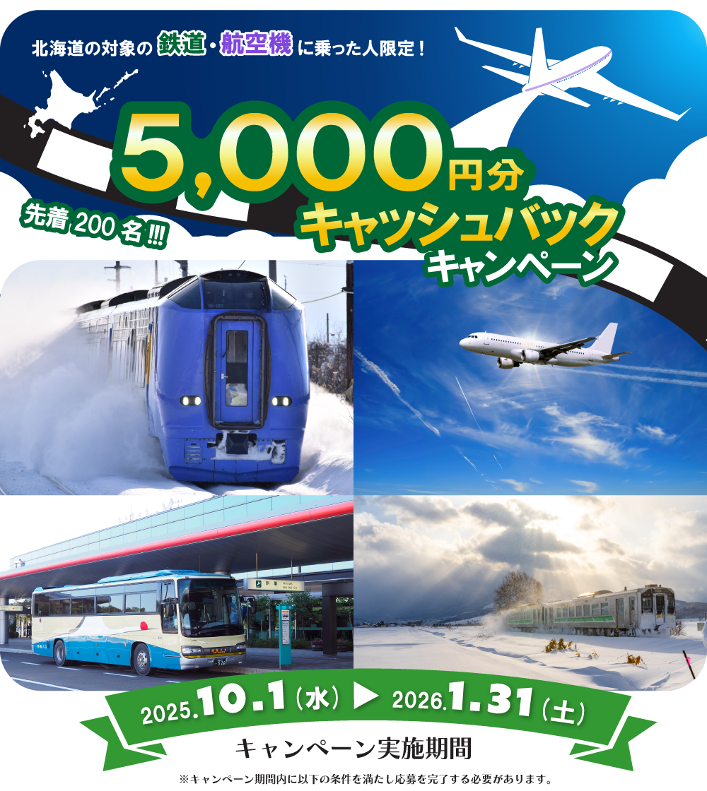 - 内容:期間中に以下の3つの条件を満たした道外在住旅行者を対象として、先着200名にQUOカードPay5,000円分のキャッシュバックを実施します。