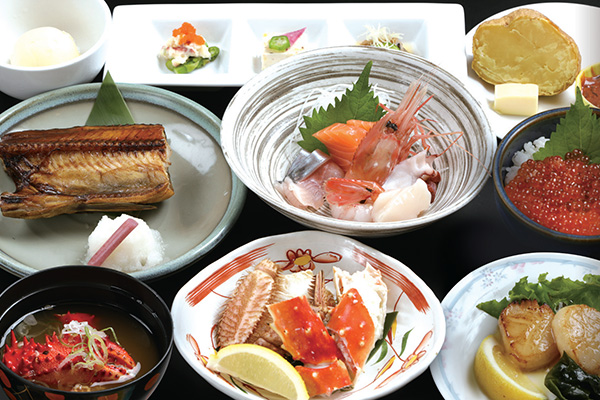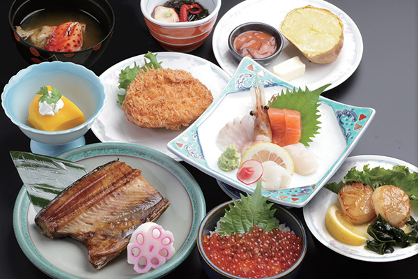 (しまほっけ(半身)・刺身・いくら醤油漬・小鉢・ご飯・かに汁)