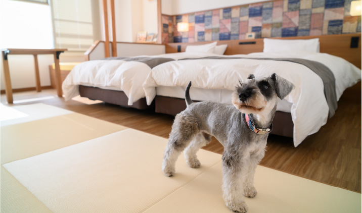 最愛のワンちゃんとともに、温泉リゾートが楽しめる和洋室。ペットアメニティも充実したゆったりした空間で上質な滞在を。