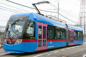 これは、2012年9月8日から走りはじめた"ドラえもんトラム"です。「トラム」は英語で、路面電車の意味です。