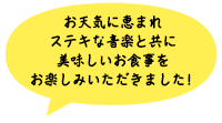 - お食事及びKアコースティックライブは屋外でのご用意となります。雨天の場合は屋根付きテントをご用意いたします。お席は相席となり事前に選べません。また、ご希望をお受けすることはできません。