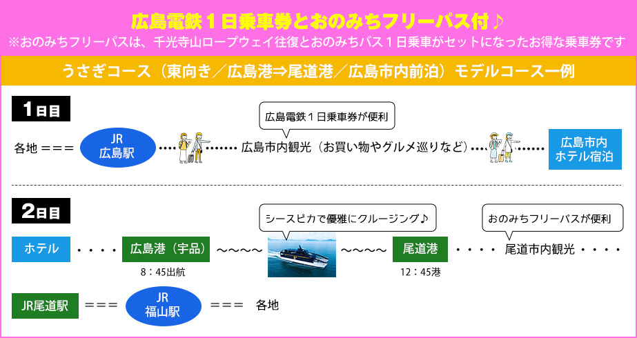 - 【うさぎコース・しまなみコース(広島後泊及び尾道前泊)共通】JR福山駅⇔JR尾道駅間は在来線普通列車のご利用となります。