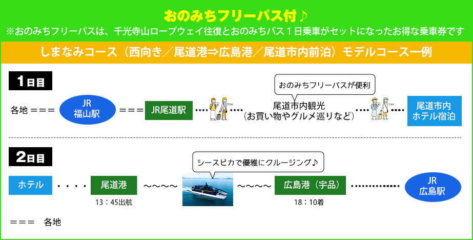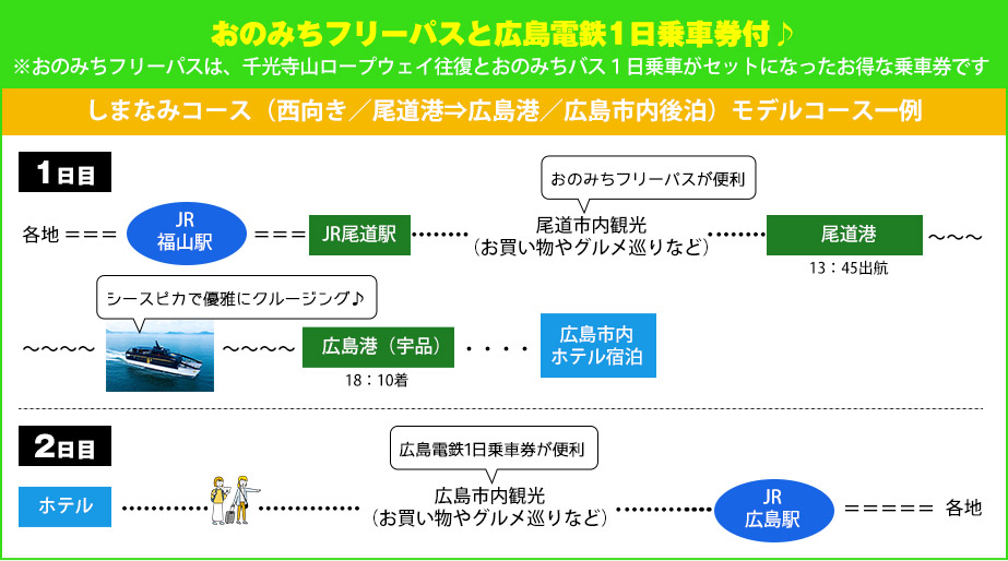 往復JR+シースピカ乗船+広島市内宿泊+おのみちフリーパス+広島電鉄1日乗車券