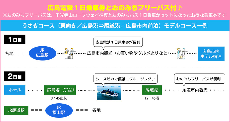 往復JR+シースピカ乗船+広島市内宿泊+おのみちフリーパス+広島電鉄1日乗車券