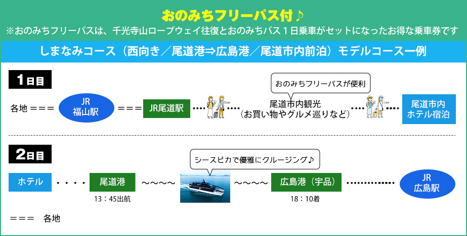 往復JR+シースピカ乗船+尾道市内宿泊+おのみちフリーパス