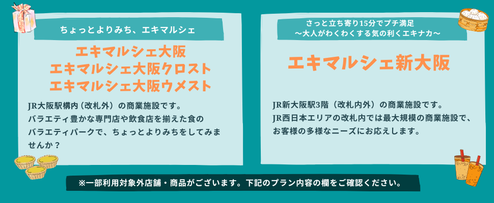 - ●対象外店舗/エキマルシェ大阪:Dream Shop、JTB、セブイレレブン ハートイン、銀行ATM