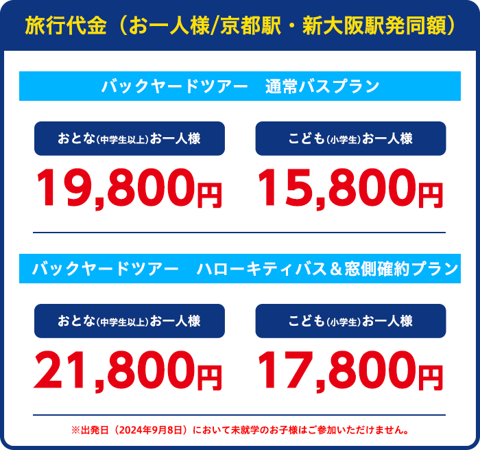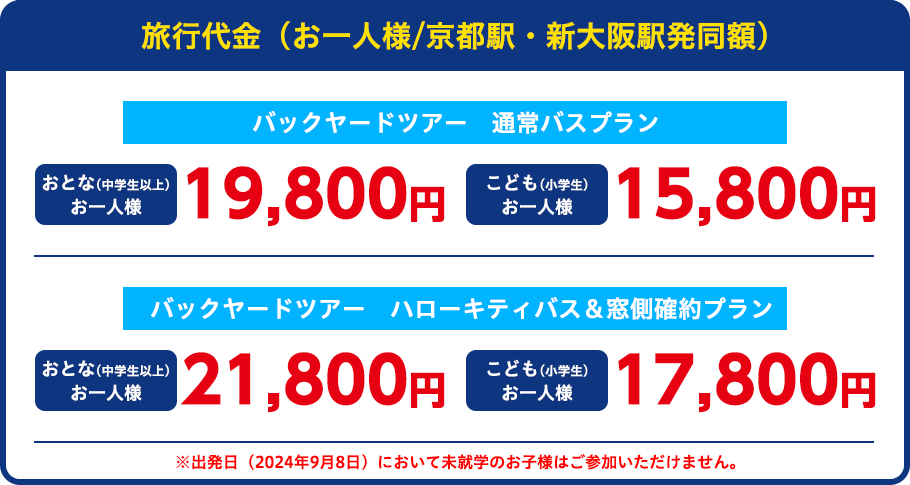 - こども代金(小学生)のお子様のみのお申し込みはできません。 こども(小学生)のご参加には必ず保護者の同伴が必要です。
