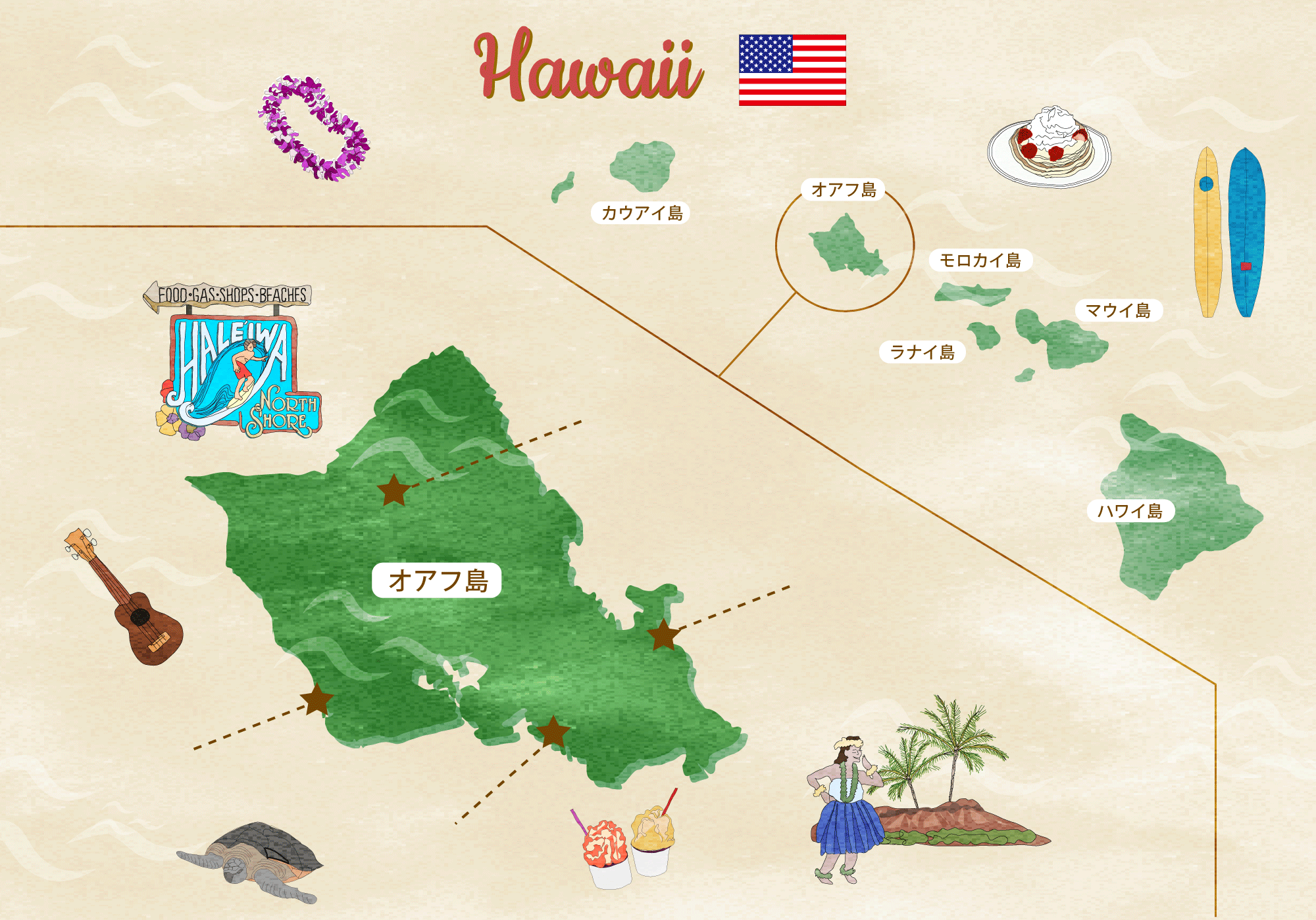 南北全長約2.5kmの小さな街ながら、名物グルメにアート、ショッピングも楽しめます。ホノルルとはまた違った空気が流れるハレイワはまるでタイムスリップしたかのような、懐かしい雰囲気で溢れています。