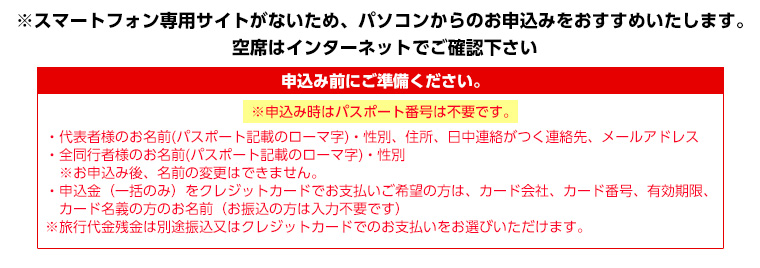- ・1回の入力でお申込みいただけるのは、同じお申込み内容(日程・発着地・コース・ホテルクラス)ご希望の5名様までです。