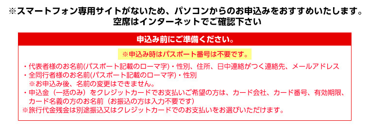 - ・1回の入力でお申込みいただけるのは、同じお申込み内容(日程・発着地・コース・ホテルクラス)ご希望の5名様までです。