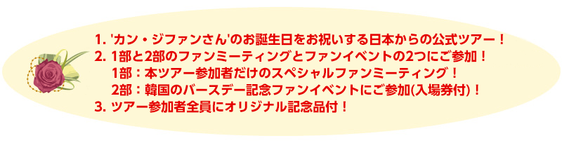免税店(1店)へご案内 会場へご案内 'カン・ジファン' 1部:本ツアー参加者だけのスペシャルファンミーティング! 2部:韓国のバースデー記念ファンイベントにご参加(入場券付)! イベント終了後、ホテルへ <ソウル泊> |