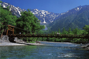 標高約1,500mの山岳景勝地。清らかな梓川に架かる河童橋と穂高連峰の山々の姿は、上高地を代表する景色です。「神の降り立つ地(神降地)」とも称され、毎年多くの人々が訪れます。