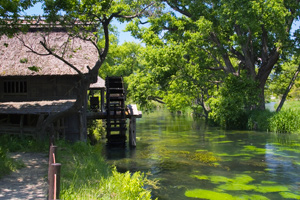 広大なわさび田、水車小屋など、日本の原風景を思わせる景色が広がります。場内を流れるアルプスの湧水は、心まで潤すような美しさ。夏はクリアボートで湧水の川を巡るのがおすすめ。