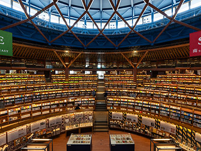 外観はページをめくる本をイメージしており、館内は吹き抜けの天井を中心に曲線を描く円形劇場のような美しい本棚が並んだ洗練されたデザインで、写真映えすること間違いなし!図書館では、マルシェやワークショップなどのイベントも定期的に開催されていて、本を借りる以外の楽しみもあります。