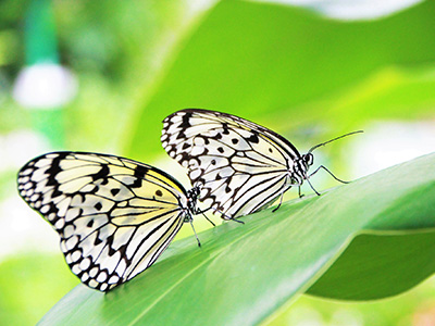 一年中常夏の「チョウの園」には千匹ものチョウが飛び交い帽子を被ってチョウと記念撮影もできますよ。