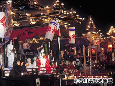 小松市の一大イベント「お旅まつり」は『莵橋神社(うはしじんじゃ)』と『本折日吉神社(もとおりひよしじんじゃ)』の2社の春季例大祭として、毎年5月に開催されています。祭りの目玉である「曳山子供歌舞伎」は、近江長浜、武蔵秩父とともに日本三大子供歌舞伎のひとつに数えられています。漆や金箔などで装飾された絢爛豪華な高楼式の曳山は小松市指定文化財、お旅まつりの曳山行事は石川県の無形民俗文化財に指定されています。クライマックスは、個性的なデザインが施された曳山が一堂に会する「曳山曳揃え」。ライトラップされた曳山が黄金色に輝く瞬間は、息を呑む美しさです。