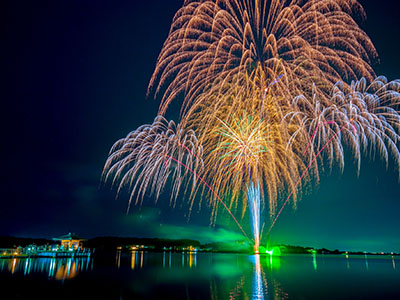 片山津温泉納涼花火まつりは、片山津温泉街に面した柴山潟湖上から打ち上げられる花火大会です。期間中は毎晩開催され(約10分間)、お宿のお風呂に浸かりながらゆったり眺めるのもお勧めです。また、夜の柴山潟に屋形船で繰り出し、湖上で花火を真下から見ることができる"花火クルーズ"、湯の元公園がさまざまな夜店で賑わう"うきうき縁日"も人気です。夏の風情を花火と共にお楽しみください。