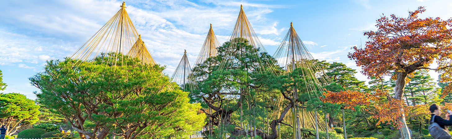 金沢の冬の風物詩の代表格といえば「雪吊り」。北陸特有の湿った重い雪から木の枝が折れるのを防ぐために行われる伝統的な作業で、例年11月1日に兼六園の唐崎松(からさきのまつ)を皮切りに、12月中旬頃まで市内各所で雪吊りの作業が見られます。雪吊り作業が始まると、金沢市民は冬の訪れが近いのを感じます。雪吊りをされ、うっすら雪化粧している松などの姿はこの時期ならではの美しさ。雪吊りは3月中旬頃まで見ることができます。