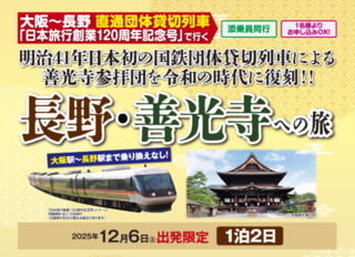 - 【12/6関西発】直通団体貸切列車「日本旅行創業120周年記念号」で行く!長野・善光寺への旅1泊2日