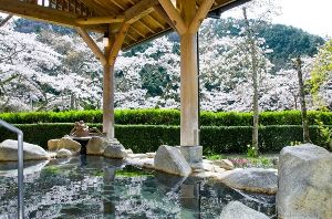 - 桜に囲まれてお湯を楽しむ
