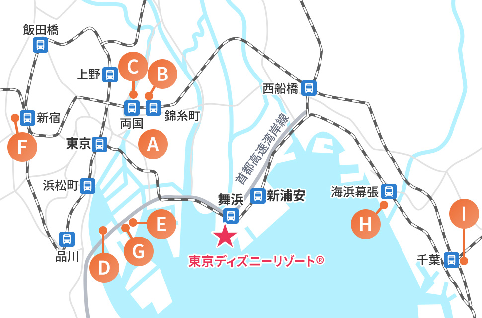 - 新幹線でJR東京駅についた後、東京ディズニーリゾート®があるJR舞浜(まいはま)駅へはどのように行けばいいですか?