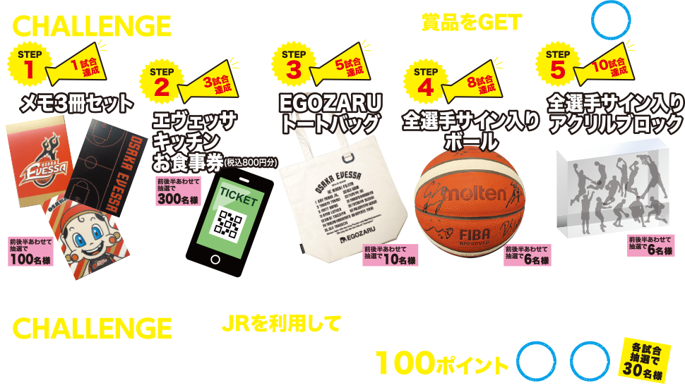 - STEP2の賞品「エヴェッサキッチンお食事券」は試合当日アプリ内で即日抽選、その他賞品は後日抽選となります。