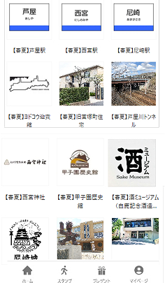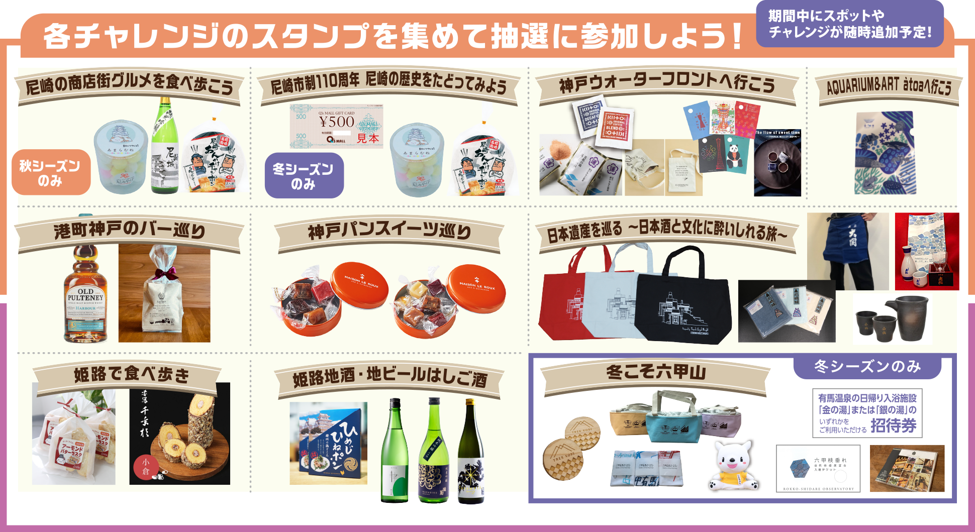 - 阪神間エリアチャレンジにおけるJR芦屋駅・JR西宮駅・JR尼崎駅、神戸エリアチャレンジ及び神戸ウォータフロントへ行こうにおけるJR三ノ宮駅・JR元町駅・JR神戸駅のスタンプはシーズンごとにいずれか1個まで取得が可能です。