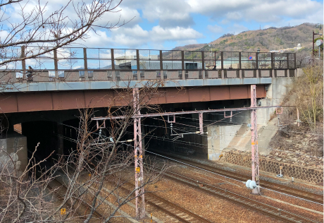 川の下を電車がくぐる、不思議な感覚になる珍しい場所です。現在は跨線水路橋となっていますが、かつては芦屋川トンネルとして建設され、列車がトンネルを通って芦屋川を越えていきました。住吉川にも同様の跨線水路橋が残っています。