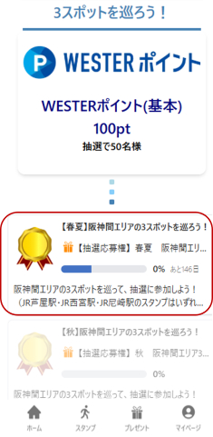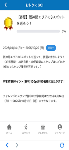 - WESTERアプリよりICOCA利用によるスタンプの付与が完了した旨のプッシュ通知が送られますのでご確認いただき、本スタンプラリーのホーム画面にアクセスください。