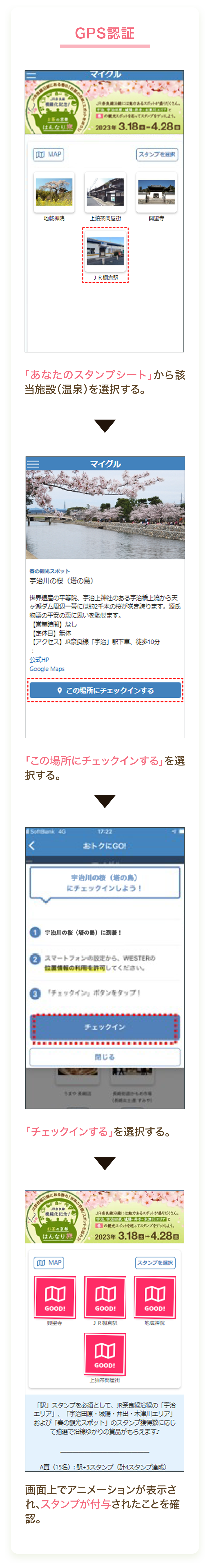 - スタンプは予めスタンプシートに設定された店舗・施設等を訪問、ご利用いただいた際に指定の押印方法(全スポットGPSでのチェックイン)によりデジタルスタンプが獲得出来ます。