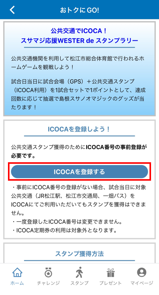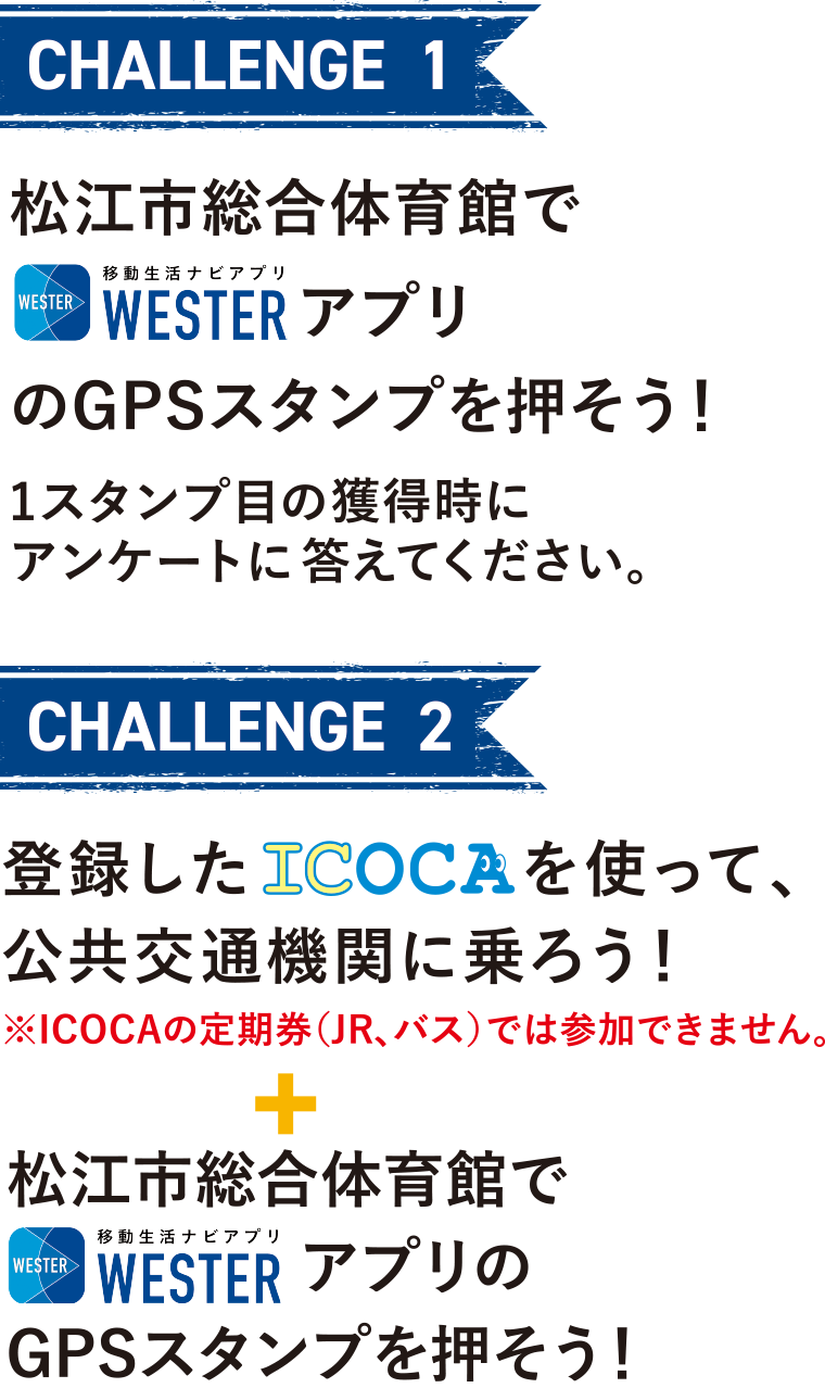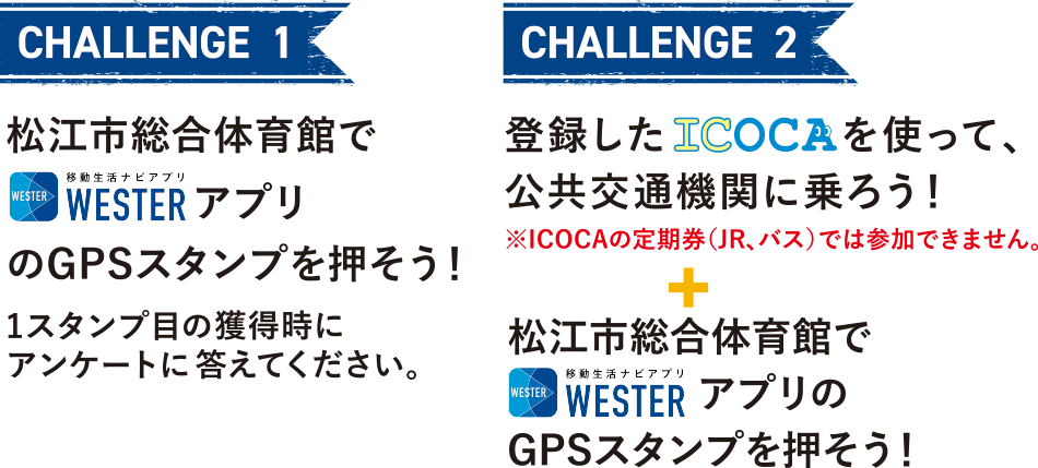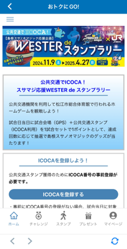 ※試合開催日にJR松江駅、松江市営バス、一畑バスをICOCAで利用し、1スタンプ獲得、松江市総合体育館でWESTERアプリのGPSスタンプを押すと、1スタンプ獲得、1試合に最大2スタンプ付与されます。