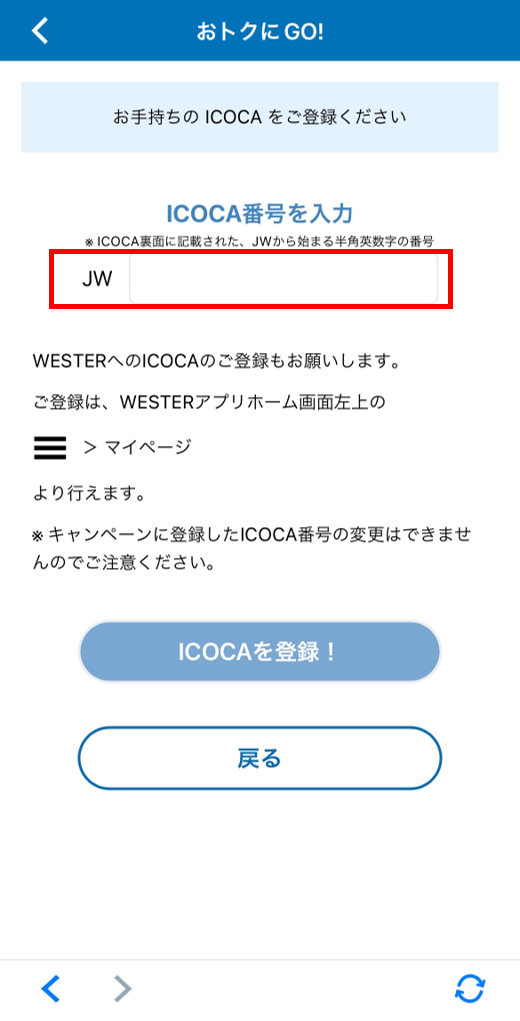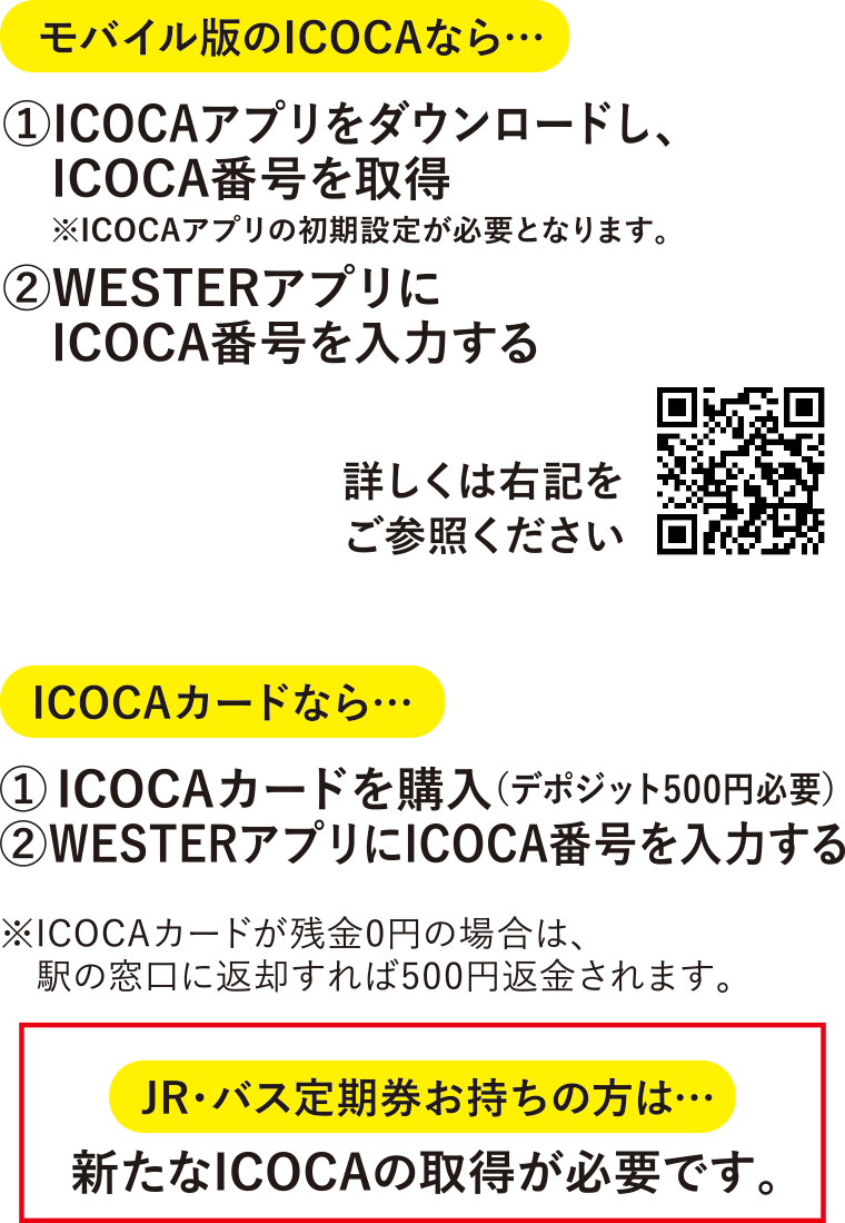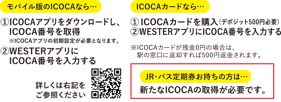 - ICOCAカードの場合、ICOCAカードを購入(デポジット500円必要)後、WESTERアプリにICOCA番号を入力してください。(※ICOCAカードが残高0円の場合は、駅の窓口に返却すれば500円返金されます。)