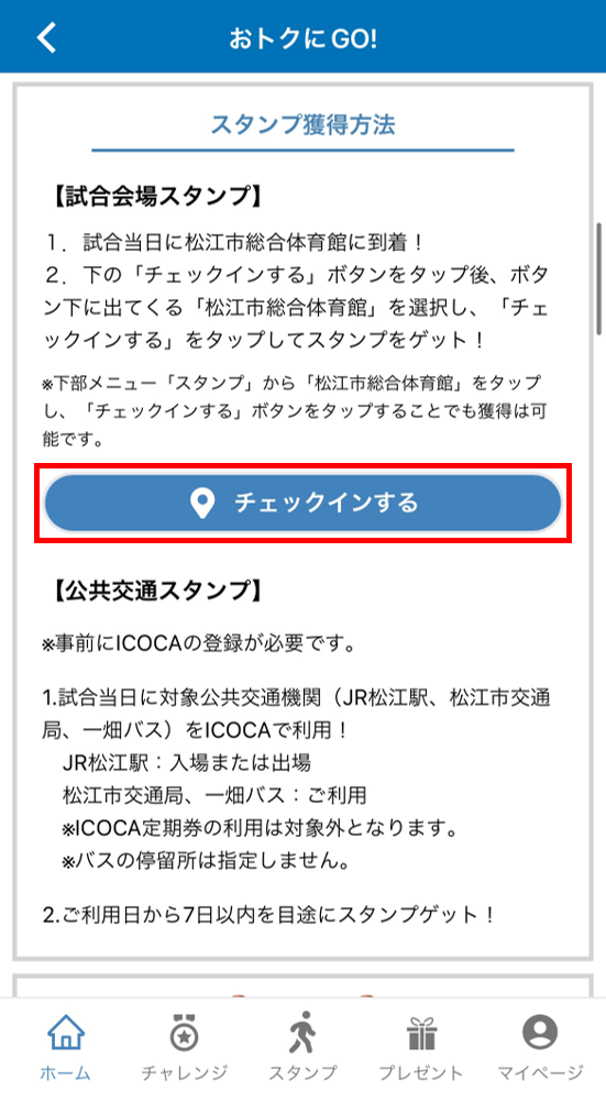 - ①ホーム画面スタンプ獲得方法のチェックインをタップ!