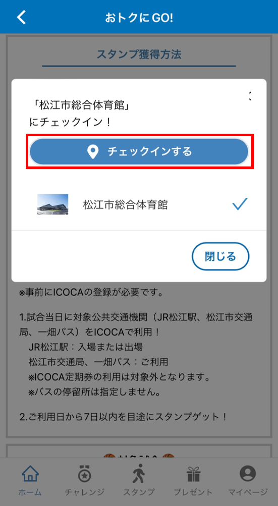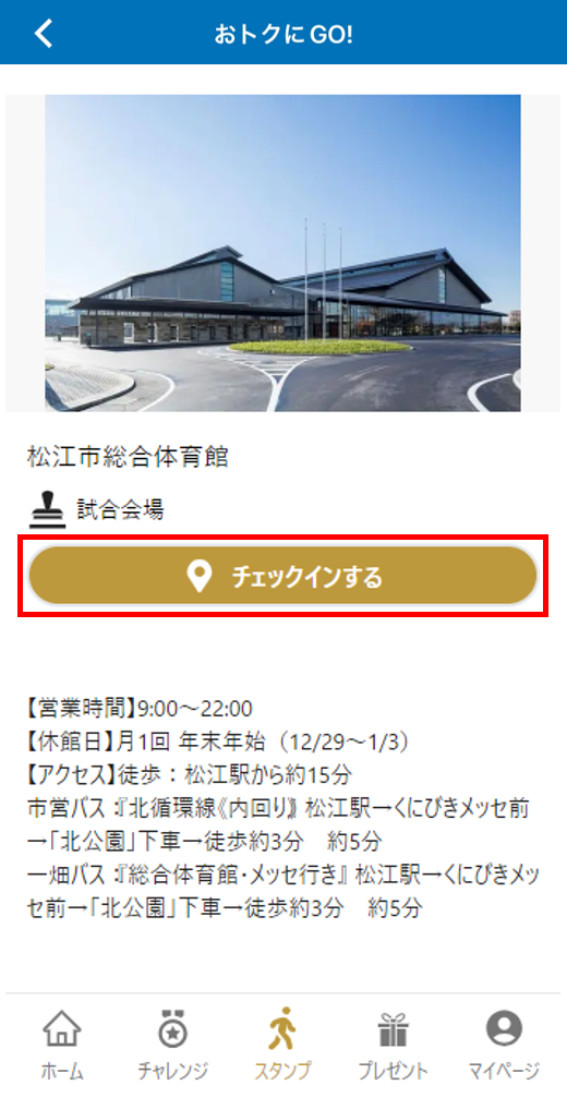 - ②「松江市総合体育館」にチェックボタンをつけて「チェックインする」をタップ!