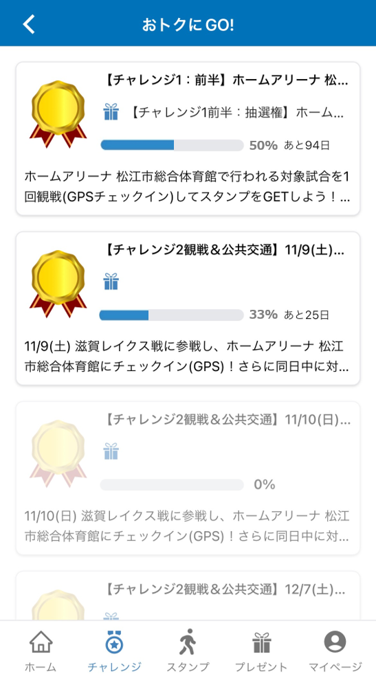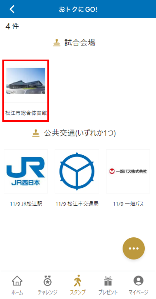 - 公共交通(JR松江駅、松江市営バス、一畑バス)をご利用された日(試合日)から7日以内を目途ににスタンプが付与されますが、諸事情により遅れる場合がございます。