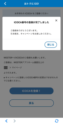 - ご参加時に一度登録されたICOCA番号は変更できません。また、再発行や、ICOCAカードをApple PayのICOCAに移行(取り込み)することにより、ICOCA番号が変わった場合を含めて、キャンペーンに登録されていないICOCAのご利用は対象外です。