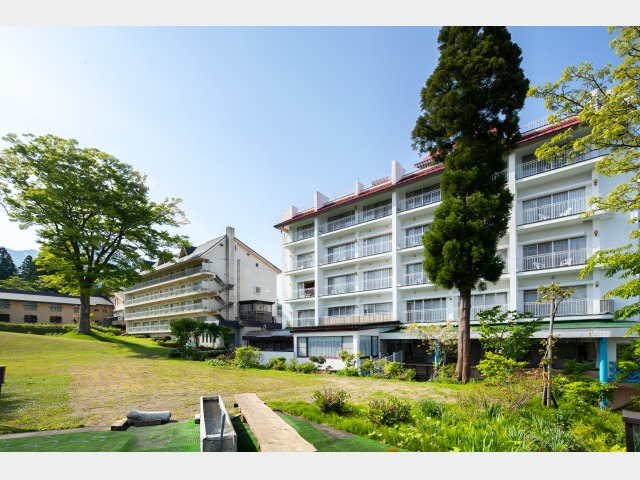 妙高高原の中腹、赤倉温泉街の中央、高台に位置し、全客室よりの眺望はすべて素晴らしく、白樺に囲まれた広い芝生の庭に囲まれた5階建白亜の建物は高原によく映えています。料理はホテルオリジナル和洋折衷会席で大好評を得ています。また当地方随一の信用を誇っています。