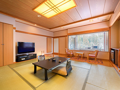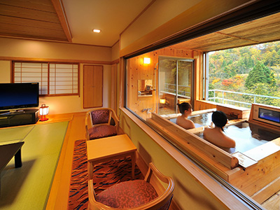 人気の半露天寝湯付きの客室で、プライベートな空間をお楽しみいただきながら、日常を忘れてゆったりとお過ごし下さい。