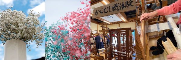 夏秋期日本一の産地・昭和村の「かすみ草」の染色体験と、名産の「からむし」から紡いだ糸を昔ながらの機織り機で織り上げる体験です。